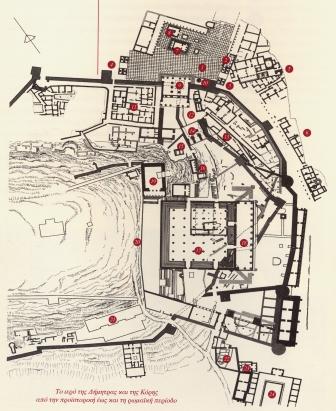 στον 4ο αι. π. Χ. Έξω από την περίμετρο των τειχών, προς τα νότια, σώζονται τα λείψανα των διαφόρων οικοδομικών φάσεων της Ιεράς Οικίας, καθώς και τα θεμέλια ενός με-