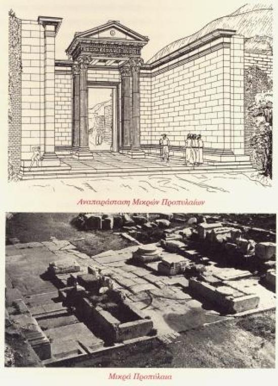 που χρησίμευε ως σιρός, δηλαδή αποθήκη σιτηρών. Στη συνέχεια ο επισκέπτης εισέρχεται στα Μικρά Προπύλαια, ένα κτίσμα του 1ου αι. π. Χ. Τη στέγη των Μικρών Προπυλαίων στήριζαν, από την εξωτερική πλευρά, δύο κίονες με περίτεχνα κιονόκρανα, τα οποία εκτίθενται στο προαύλιο του Μουσείου, ενώ από την εσωτερική πλευρά, δύο Καρυάτιδες, δηλαδή γυναικεία αγάλματα, το ένα από τα οποία εκτίθεται στο Μουσείο, ενώ το άλλο έχει κλαπεί κατά την Τουρκοκρατία και σήμερα βρίσκεται στην Αγγλία.